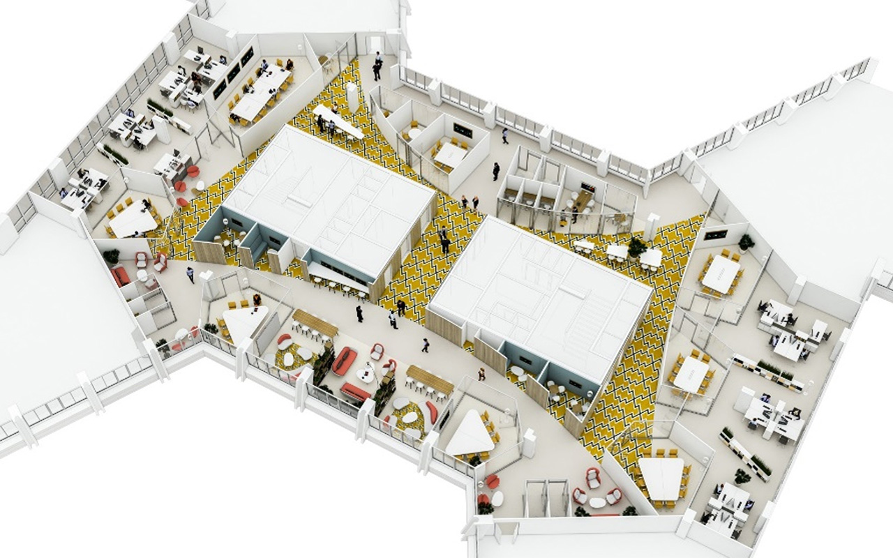 Transformation : réaménager les locaux du noyau central du bâtiment M01 afin de créer des espaces de travail conviviaux, lumineux et propices aux échanges entre collaborateurs