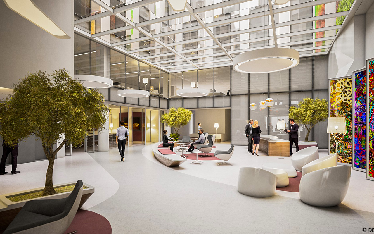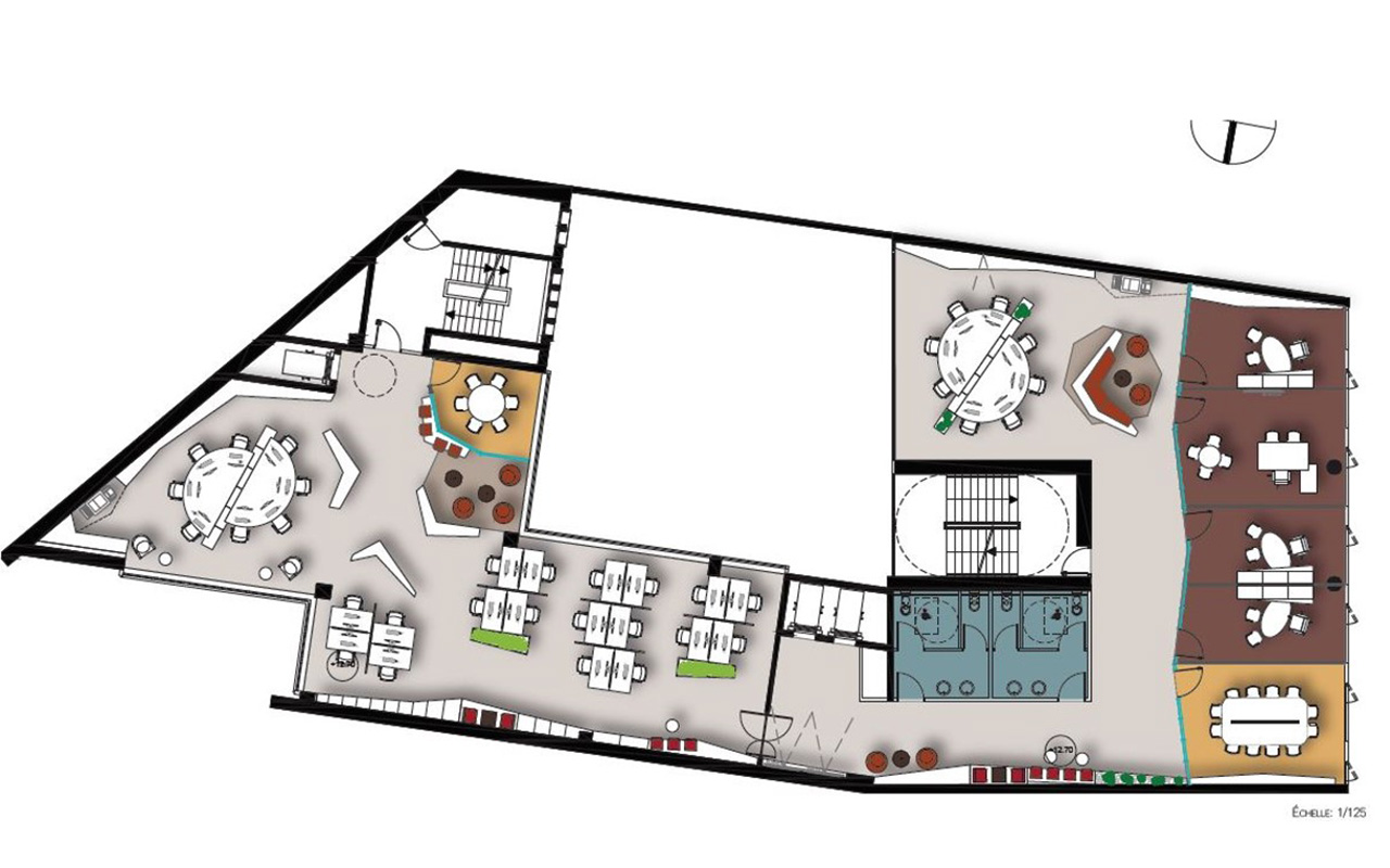 Le nouveau projet, qui rend fluide les niveaux, est basé sur un dispositif tramé. Il permet la mise en œuvre de cloisons amovibles si l’utilisateur le souhaite. La configuration d’origine qui proposait des typologies de bureaux individuel ou partagé à deux personnes était de l’ordre de 120 postes de travail soit un ratio de 20 m² de surface locative. La configuration nouvel mixte dessinée présente une densité de l’ordre de 160 poste de travail soit un ratio d’environ 16,5 m² de surface locative au poste de travail.